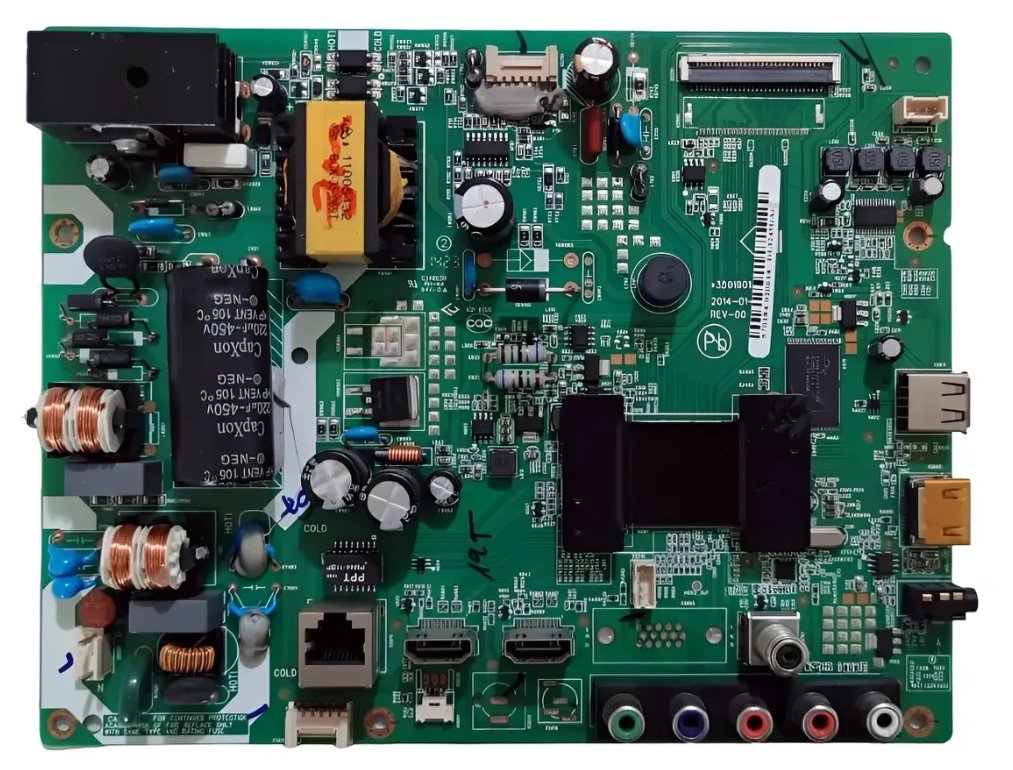 Responsável pelo processamento de imagem, áudio, sistema, HDMI, USB e controle geral do televisor.